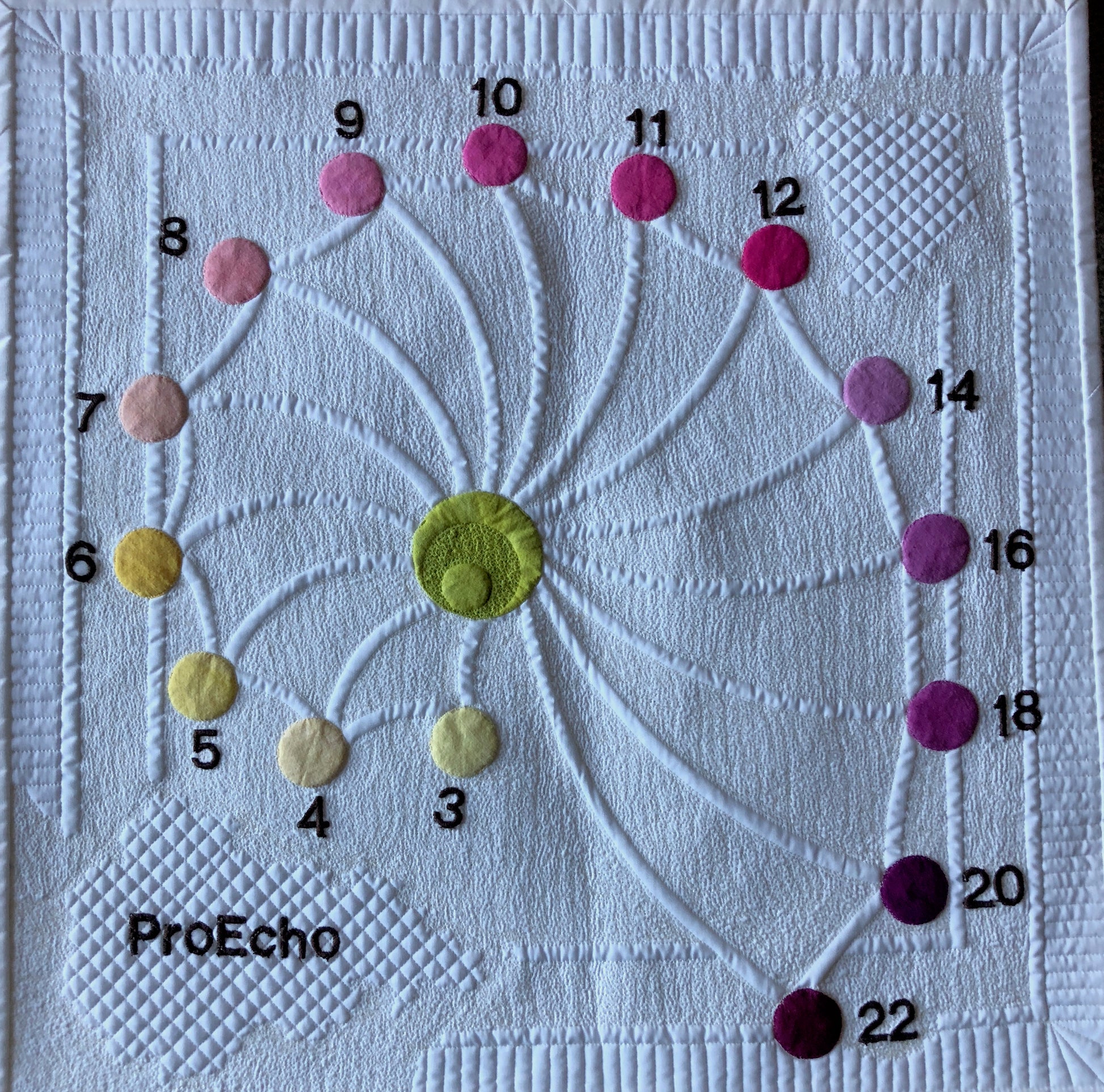 The ProEcho™ Small Set consists of 5 arcs: 3", 4 ", 5", 6", and 7". The Quilter’s Groove® ProEcho rulers were designed to give you a perfect 1/4” echo.